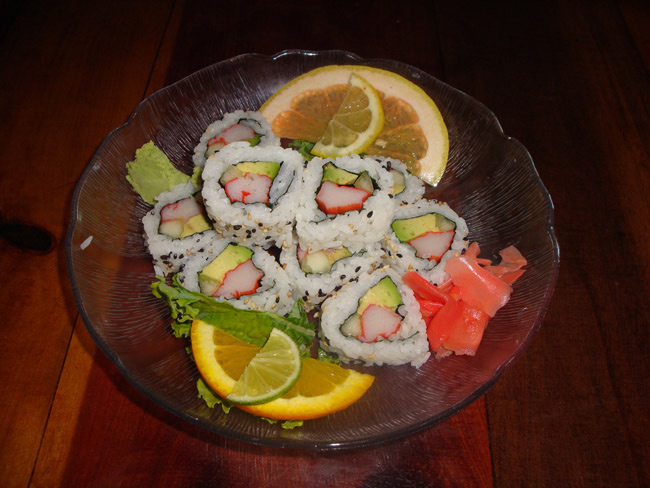 Your sushi will typically come with slices of pickled ginger and a dallop of wasabi paste. You’ll also receive a small saucer to hold soy sauce for dipping. The ginger can pack a bit of a wallop and the wasabi is very hot. The ginger is designed to cleanse the pallate and is eaten before sampling a different item.